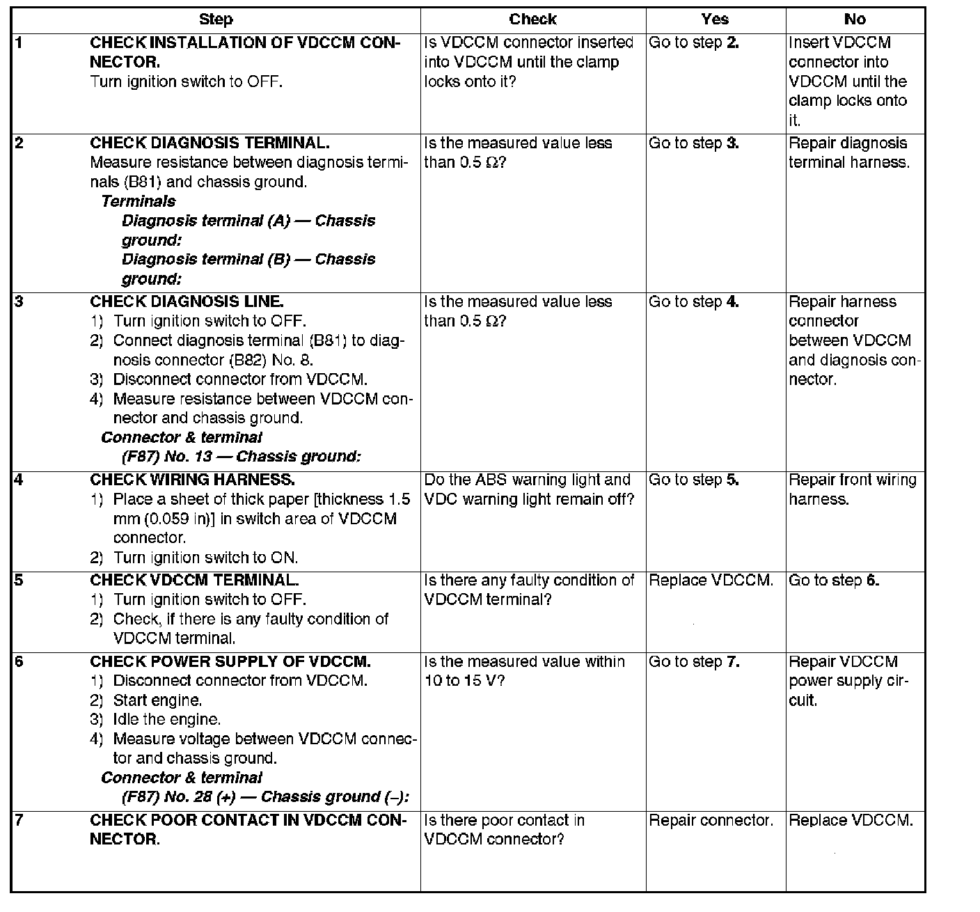 ABS AND VDC WARNING LIGHTS DO NOT GO OFFSteps 1-7: