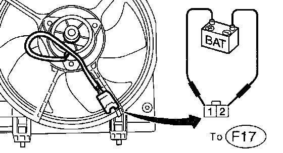 1. Connect battery positive (+) terminal to terminal No. 2, and negative (-) terminal to terminal No. 1 of main fan motor connector.