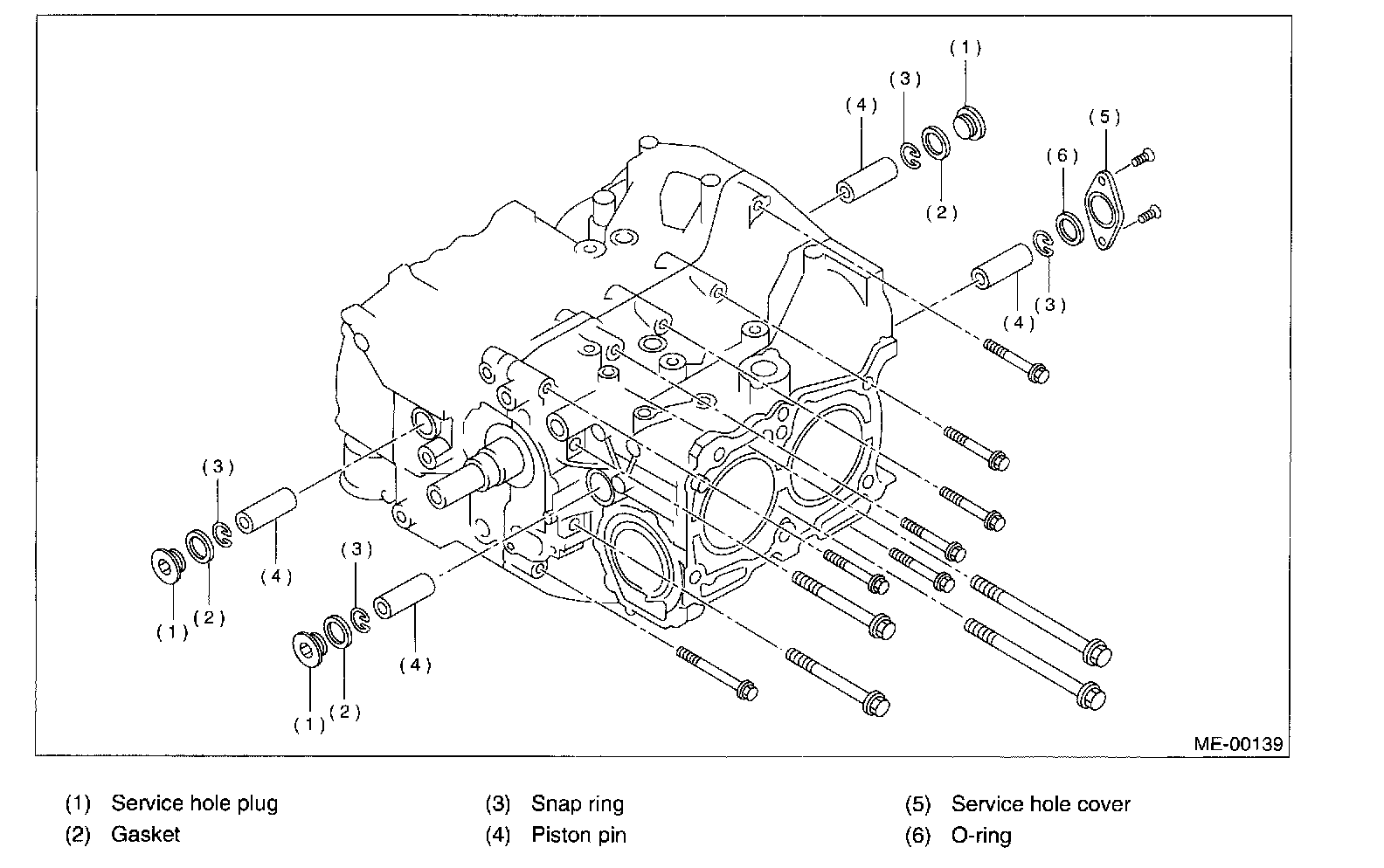28. Rotate crankshaft to bring #1 and #2 pistons to bottom dead center position, then remove piston snap ring through service hole of #1 and #2 cylinders.