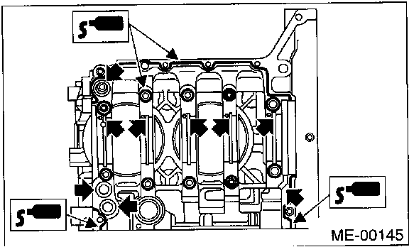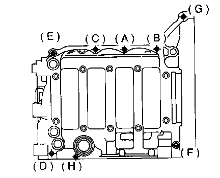 7. Tighten 8 mm and 6 mm cylinder block connecting bolts in alphabetical sequence shown in figure.