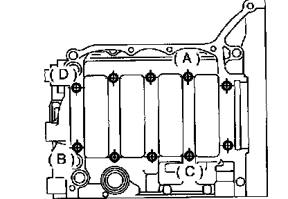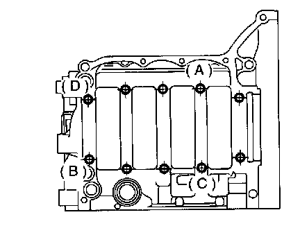 5. Tighten bolts (A to D) on left side of cylinder block more 90° in alphabetical sequence.