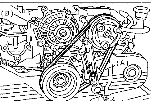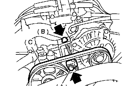 1. Install a belt, and tighten the slider bolt (B) so as to obtain the specified belt tension.