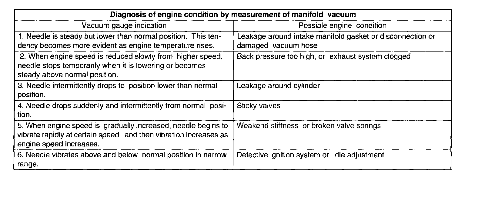 By observing the gauge needle movement, the internal condition of the engine can be diagnosed as described below.