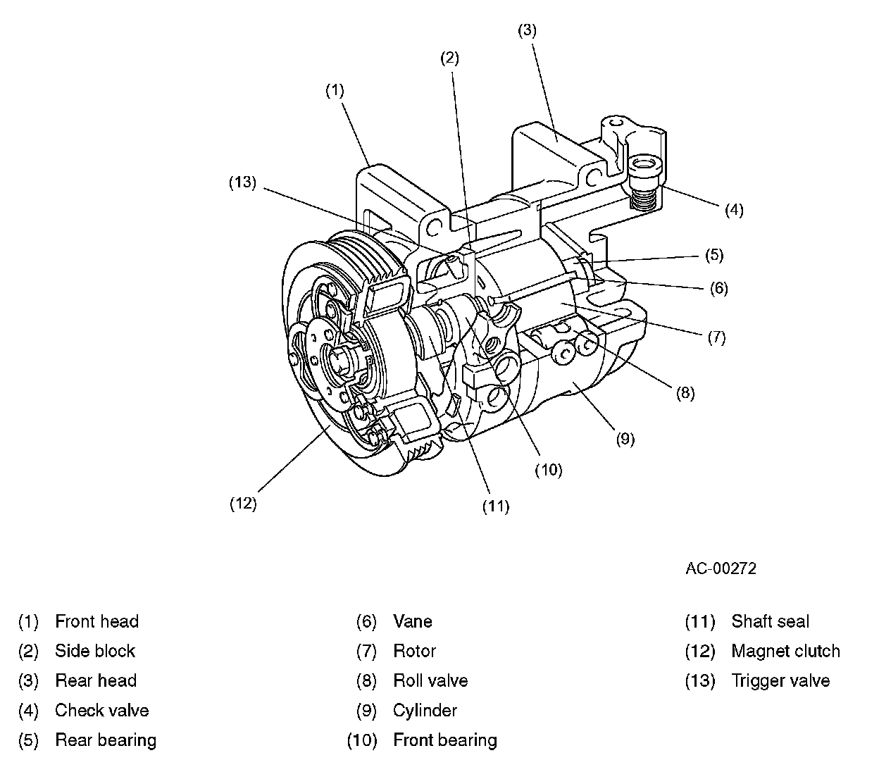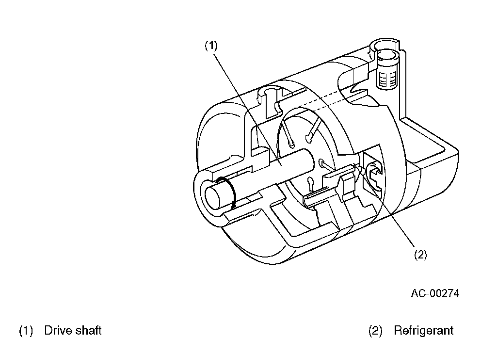 The lubrication oil is collected at the bottom of the high-pressure chamber. The high-refrigerant pressure in the chamber forces the oil upward through the oil passages in the front side block to lubricate the front end of the rotor. The high-chamber pressure also forces the oil through the passages in the bottom of the cylinder to lubricate the rear end of the rotor. The oil that has lubricated each end of the rotor enters the low-pressure chamber by the internal pressure of the compressor. The oil contained in the gaseous refrigerant from the evaporator passes through the low-pressure chamber and lubricates the rear bearing. The oil also passes through the passage in the drive shaft and lubricates the front bearing and shaft seal before entering the suction port of the cylinder.