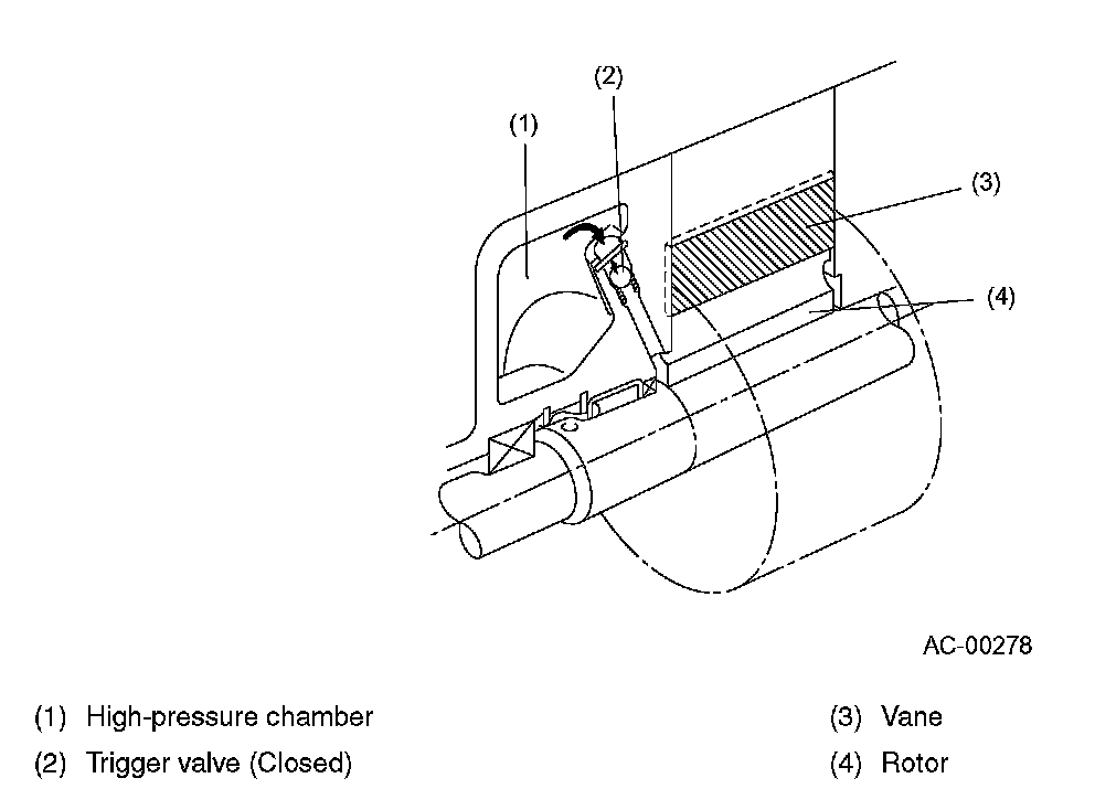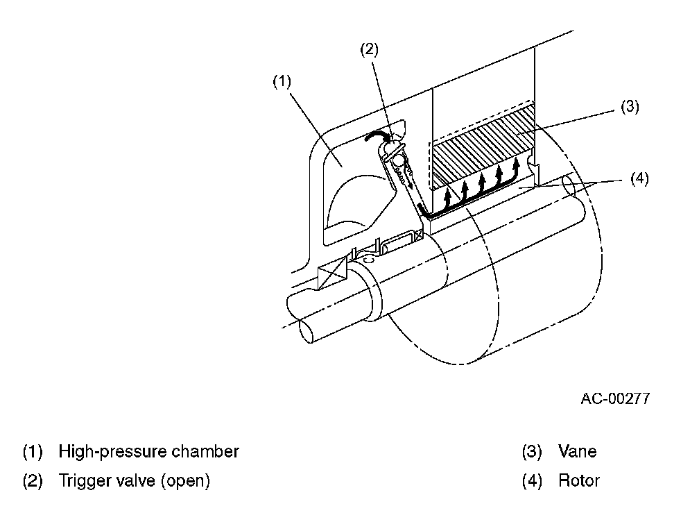 When the compressor starts or when the load is low (the high-pressure level is low), the spring can raise the check ball clear of its seat, so the trigger valve is opened. The pressure of the high-pressure chamber then acts on the back end surface of each vane to prevent it from chattering.