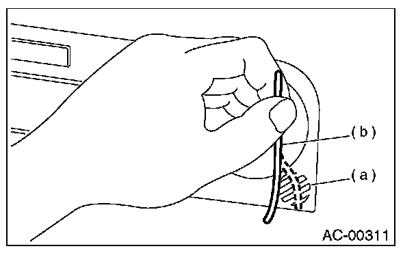 3. Firmly hold a thin thread (b) in front of the in-vehicle sensor suction port (a) for the auto A/C control unit and check that the thread moves towards the port indicating that air is being sucked into the port.