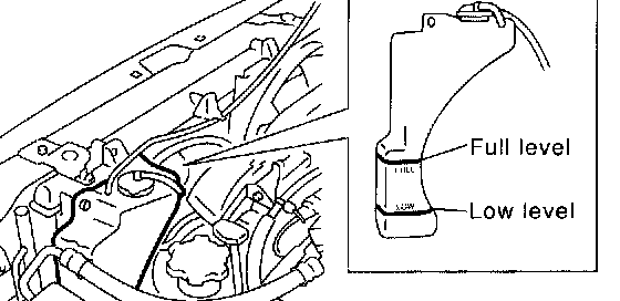 6. If engine coolant level drops from upper level of reservoir tank, add engine coolant to upper level.