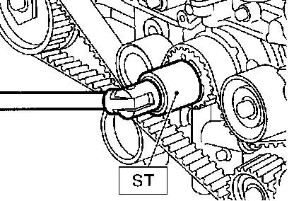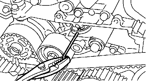 5. After ensuring that the marks on timing belt and camshaft sprockets are aligned, remove stopper pin from belt tensioner adjuster.