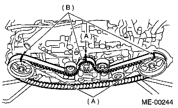 2. While aligning alignment mark (B) on timing belt with marks on sprockets (A), position timing belt properly.