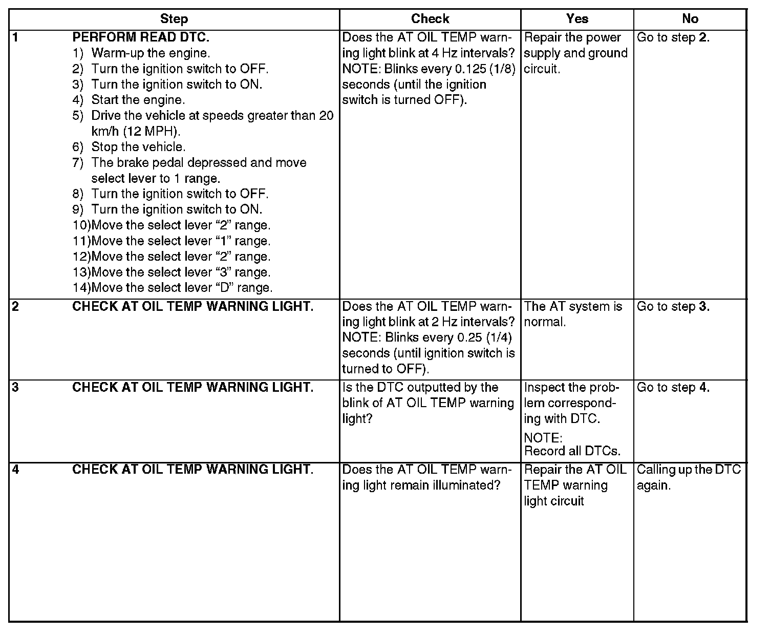 The AT OIL TEMP warning light flashes the code corresponding to faulty part.