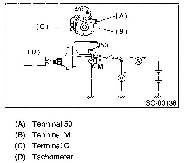 Connect two battery negative leads onto terminal 50 and onto terminal 50 and onto switch body respectively. Then connect battery positive lead onto terminal C. Next, disconnect lead from terminal 50. Pinion should return immediately.