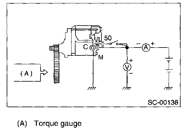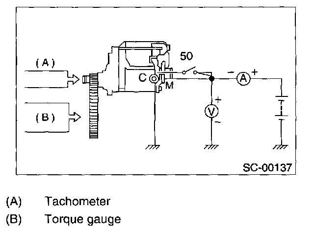 Perform this test to check maximum output of starter. Use test bench which is able to apply load (brake) to starter. Measure torque value and rotating speed under the specified voltage and current conditions while controlling braking force applied to starter.
