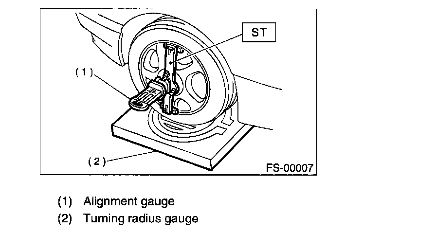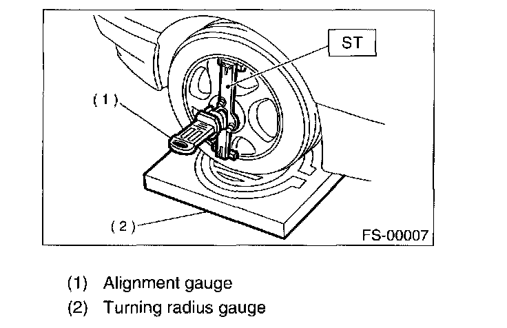 1. Place front wheel on turning radius gauge. Make sure ground contacting surfaces of front and rear wheels are set at the same height.