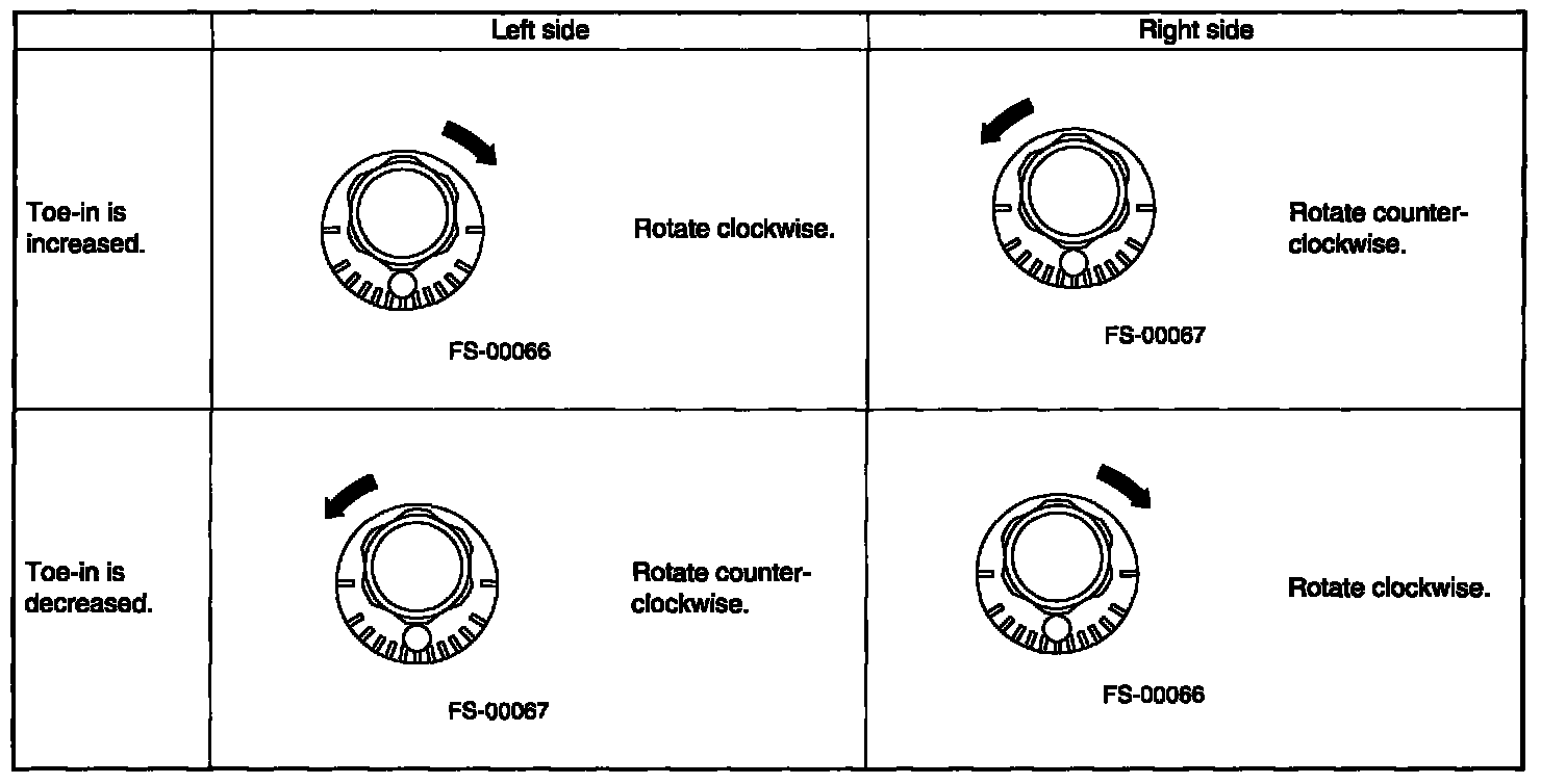 2. When one rear wheel is adjusted in a toe-in direction, adjust the other rear wheel equally in toe-out direction, in order to make thrust angle adjustment.