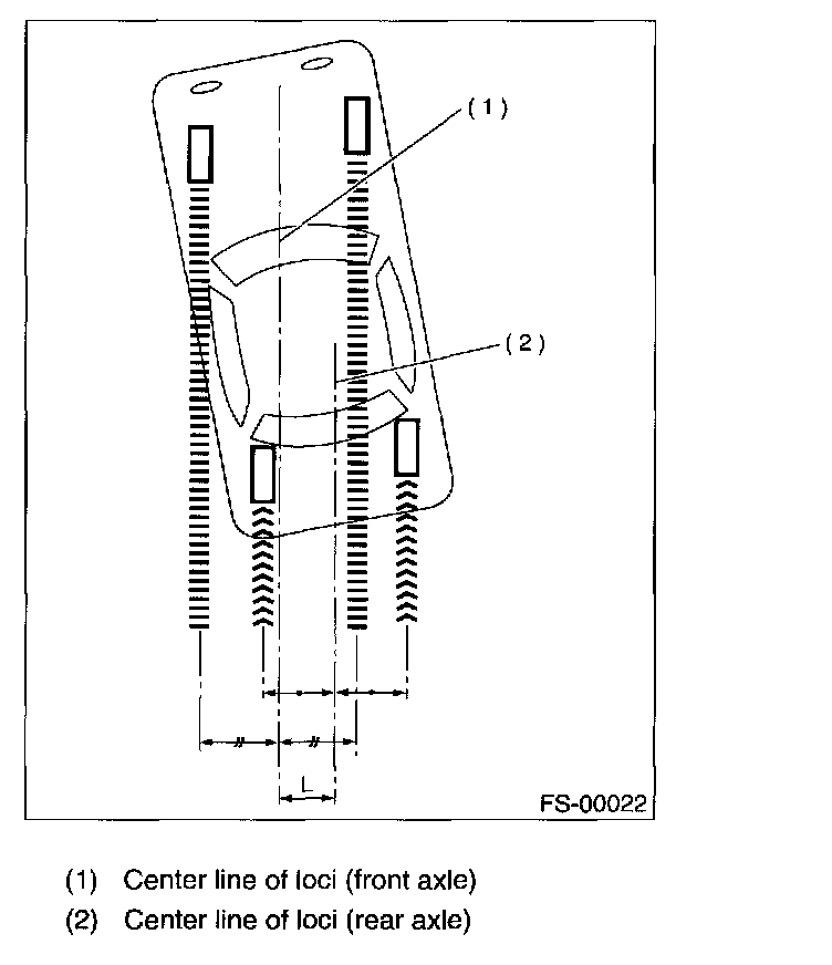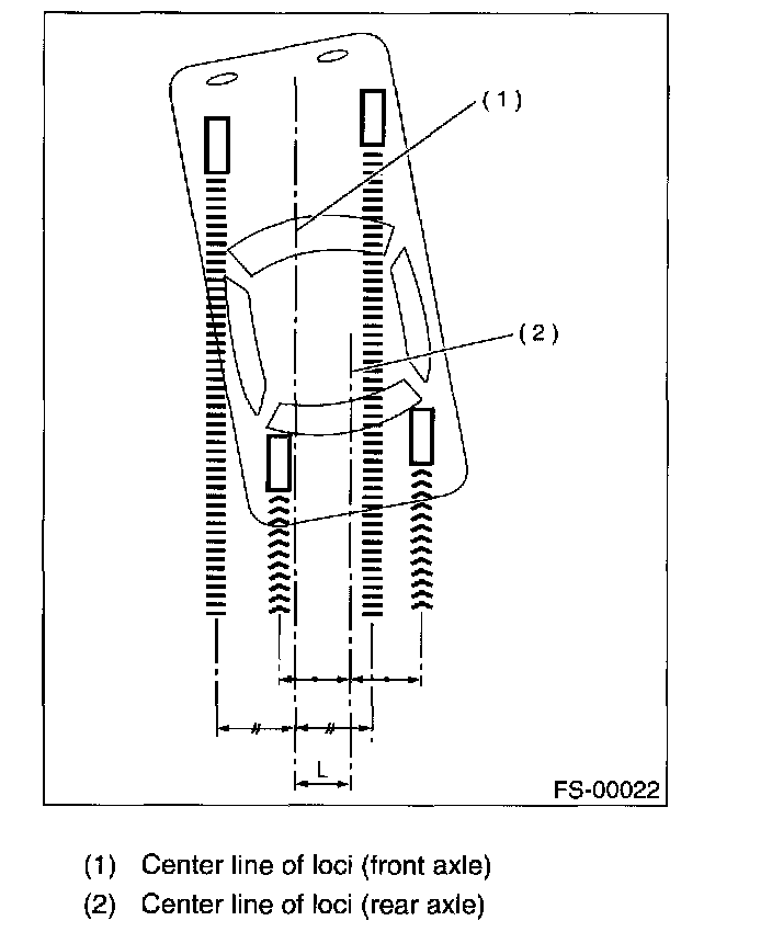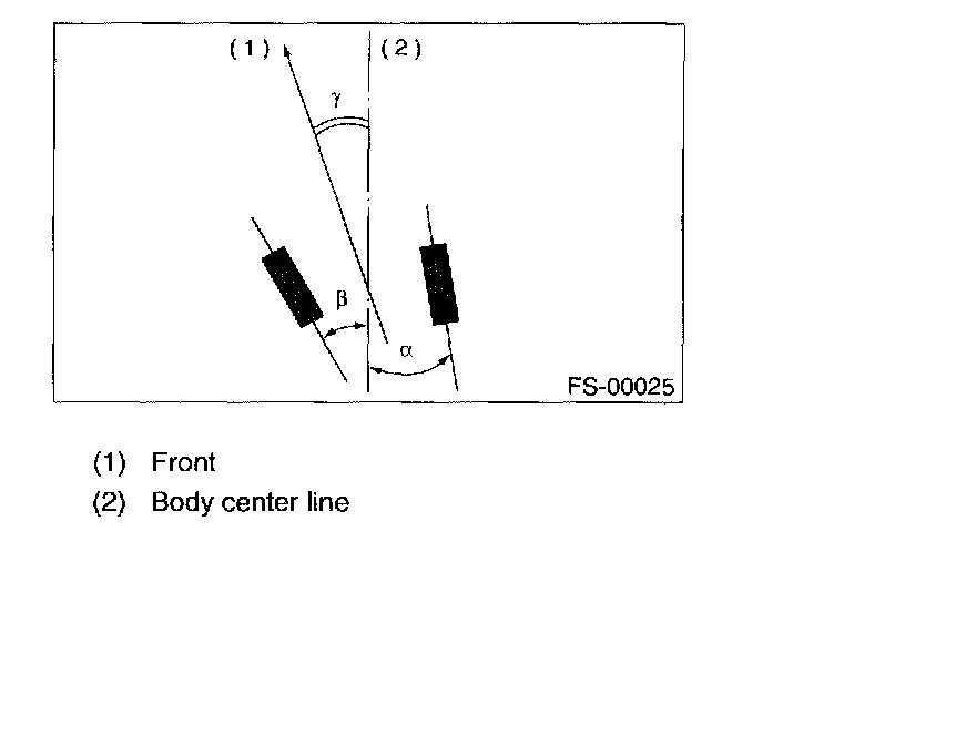 NOTE: Thrust angle refers to a mean value of left and right rear wheel toe angles in relation to vehicle body center line. Vehicle is driven straight in the thrust angle direction while swinging in the oblique direction depending on the degree of the mean thrust angle.