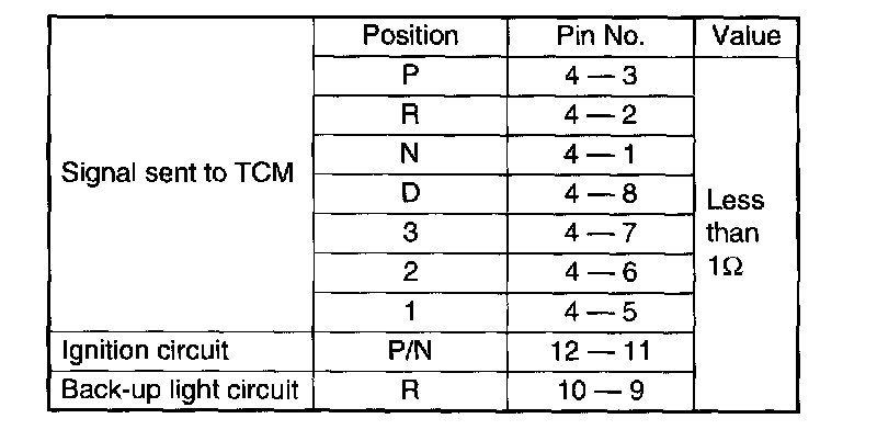 Also check that continuity in ignition circuit does not exist when the select lever is in "R", "D", "3", "2" and "1" ranges.