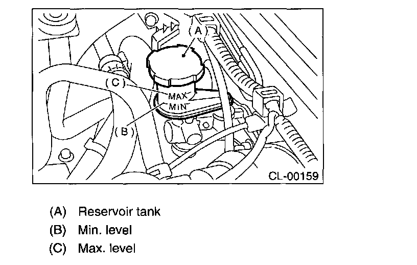 2. Inspect the fluid level using scale on the outside of the reservoir tank. If the level is below "MIN", add fluid to bring it up to "MAX", and also inspect for leakage.