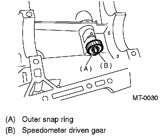 6. Remove the outer snap ring and pull out speedometer driven gear. Next, remove the oil seal, speedometer shaft and washer.