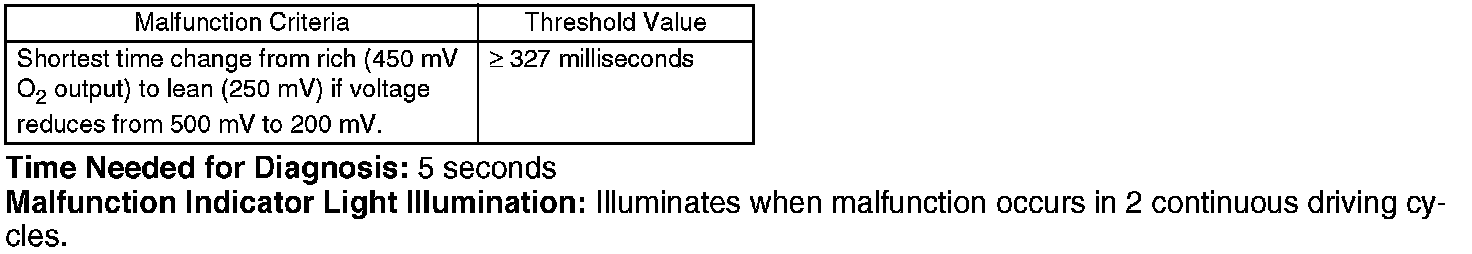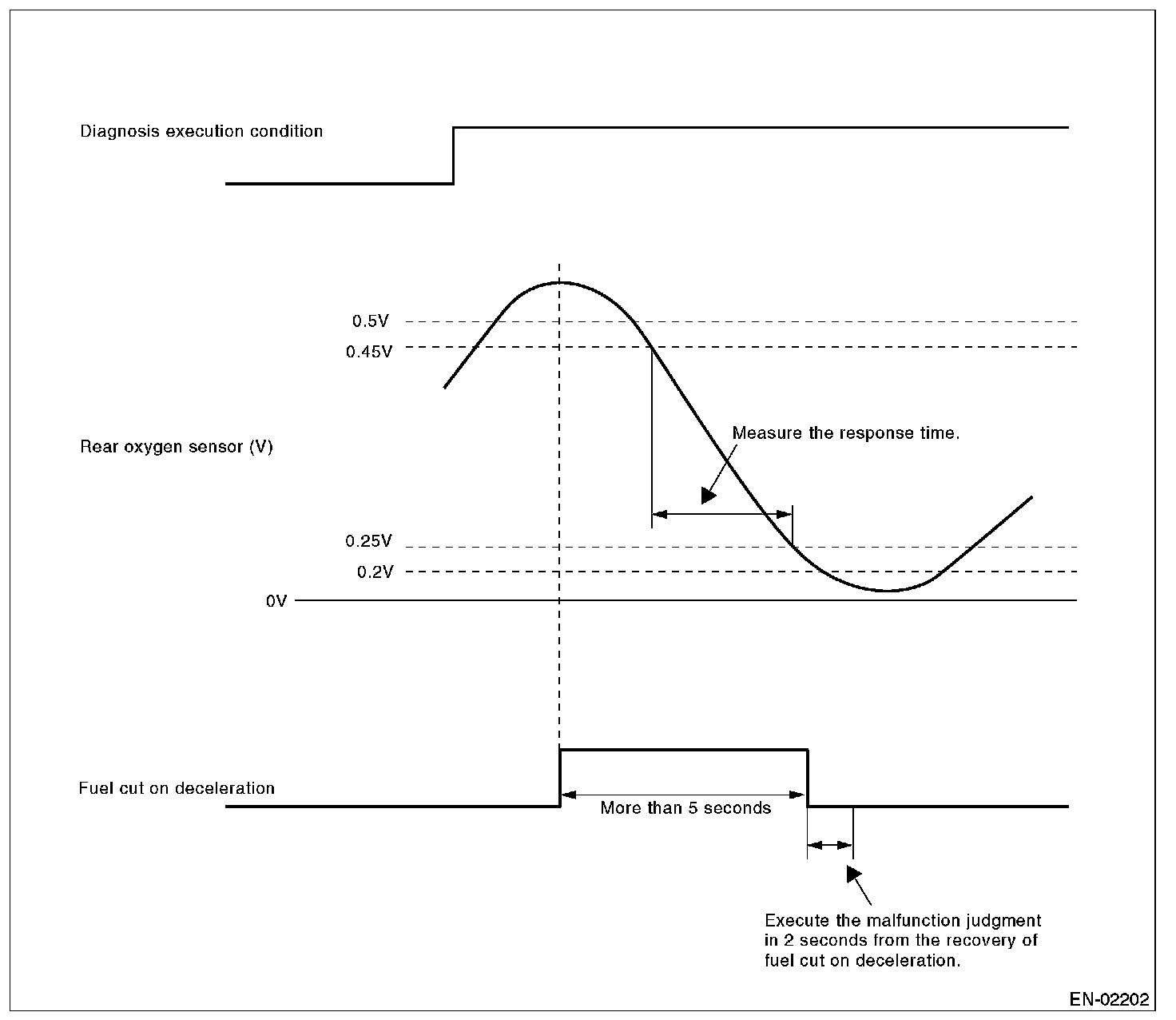 NOTE: Variation time of rear oxygen sensor output voltage is short during fuel shut-off in deceleration. Carry out the NG judgment only after the fuel shut-off in deceleration. As for OK judgment, without the condition of fuel shut-off in deceleration, judge OK if the value is below the threshold value. Judge NG when the malfunction criteria are completed in 5 seconds after the recovery of fuel shut-off in deceleration which requires 5 seconds or more. Judge OK when the malfunction criteria are not completed regardless of the fuel shut-off in deceleration.