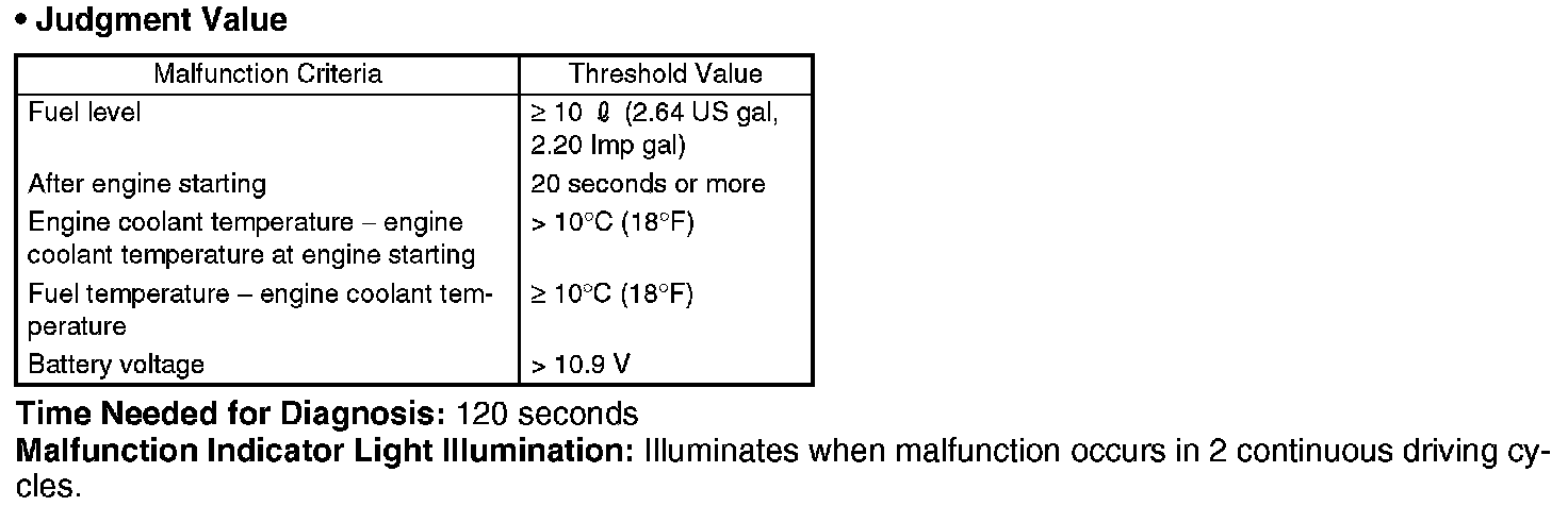 Judge NG when the continuous time of completing the malfunction criteria becomes more than 120 seconds.