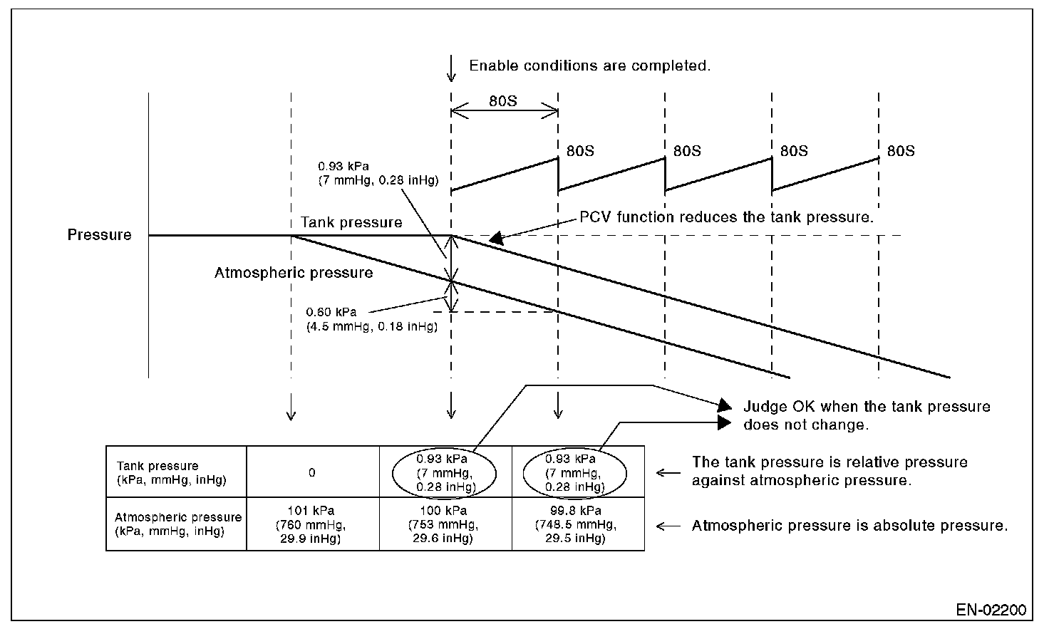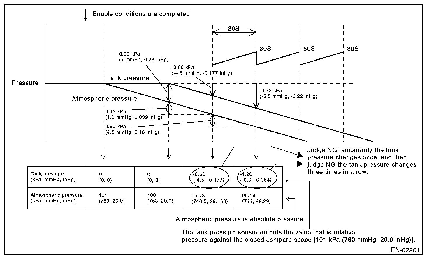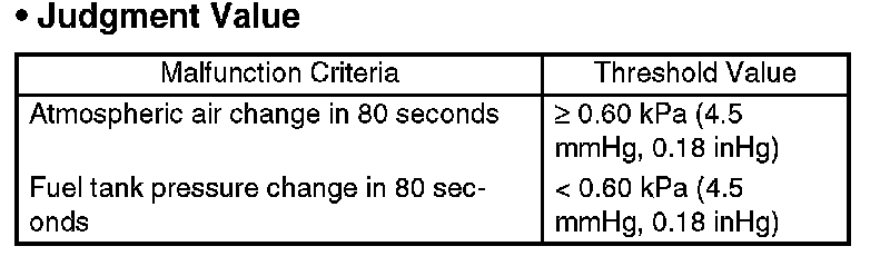 Judge OK when the fuel tank pressure does not change (or changes by less than 0.60 kPa (4.5 mmHg, 0.18 inHg)) at atmospheric pressure changing by 0.60 kPa (4.5 mmHg, 0.18 inHg) or more per 80 seconds.