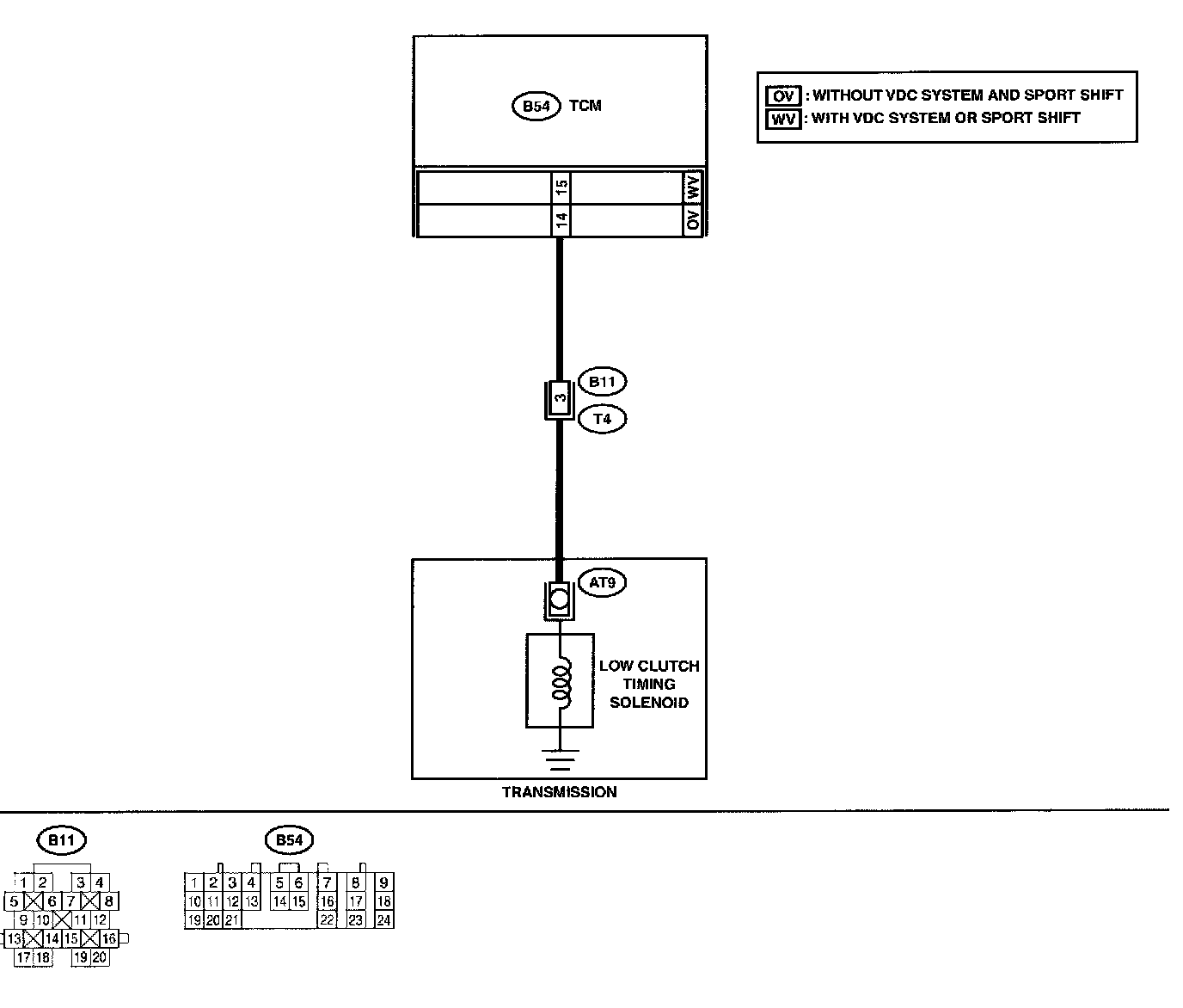 Output signal circuit of low clutch timing solenoid is open or shorted.