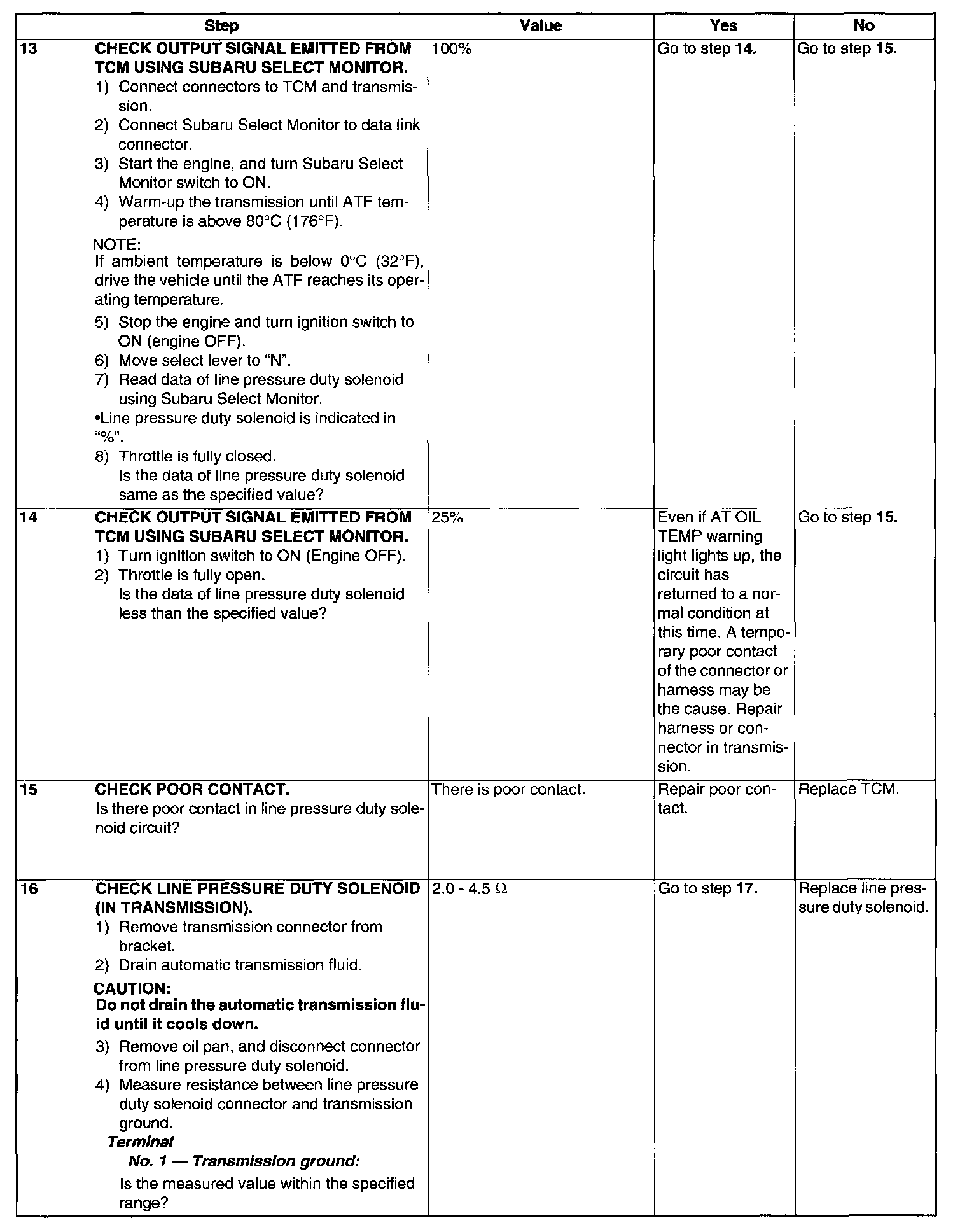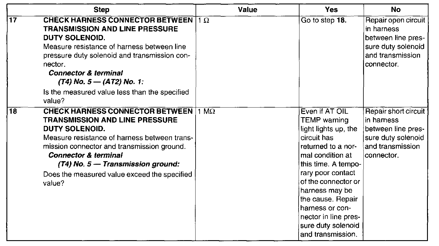 Output signal circuit of line pressure duty solenoid is open or shorted.
