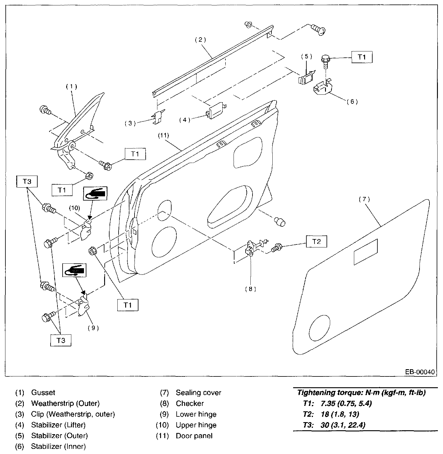 10. Remove door-side bolts for upper and lower hinges to remove door.