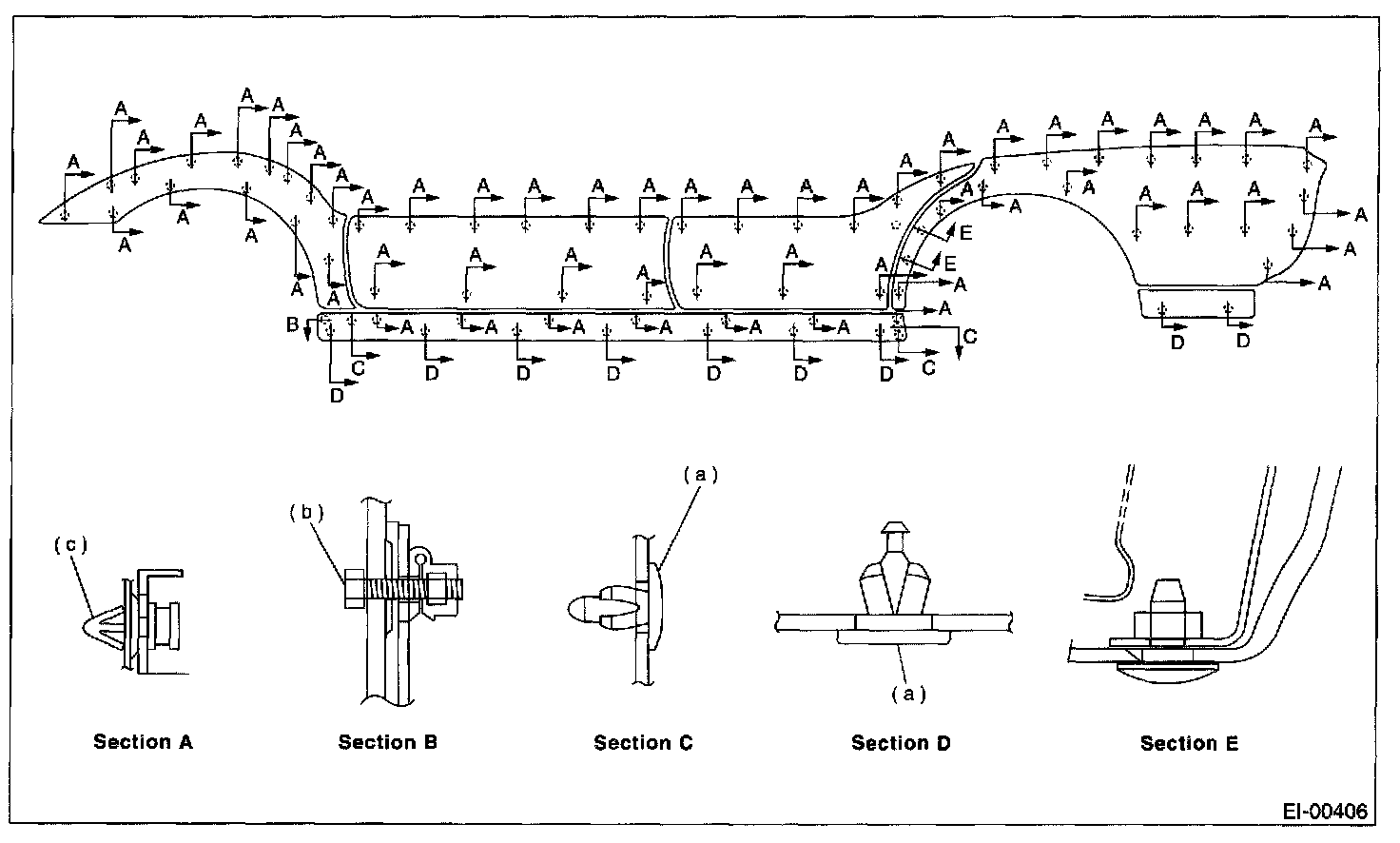 2. Insert fishing line [0.8 mm (0.031 in) dia.] (A) between side protector (B) and vehicle body. Cut (pull the line) through two-sided tape (C) along side protector on the body. Using a puller, remove clips from vehicle body while pulling side protector towards yourself as required.