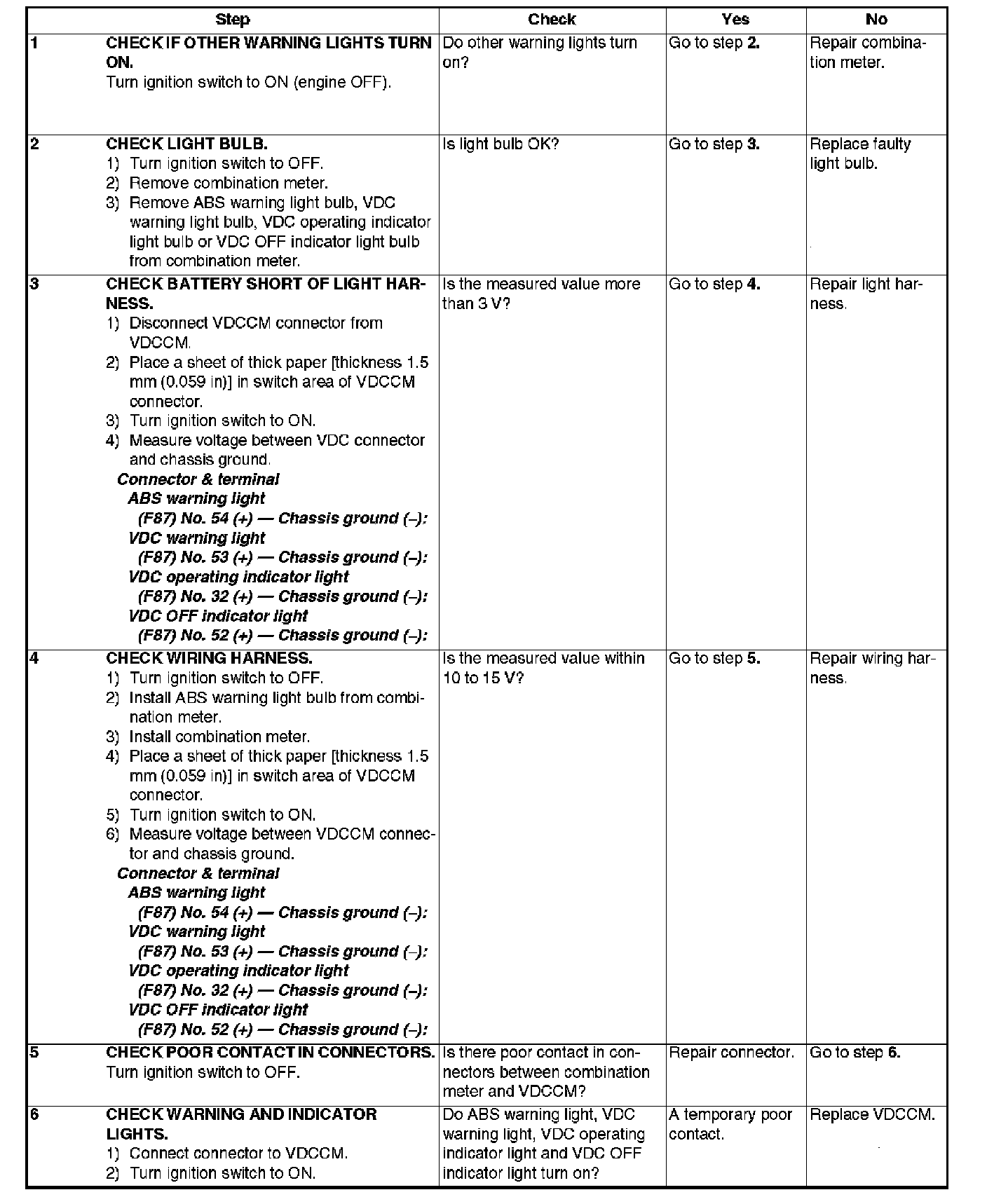 ABS WARNING LIGHT, VDC WARNING LIGHT, VDC OPERATING INDICATOR LIGHT OR VDC OFF INDICATOR LIGHT DOES NOT COME ON.Steps 1-6: