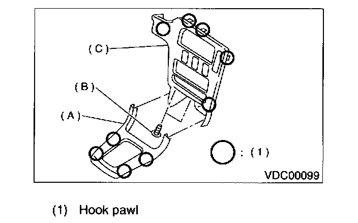 3. Remove two screws (B) and then remove center panel (C) while disconnecting connector.