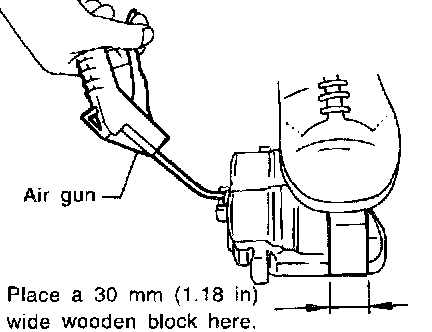 3. Place a wooden block as shown in the figure to prevent damage to the piston. Gradually supply compressed air via inlet of the brake hose to force piston out.