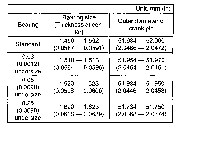 3. Inspect the crank journal and crank pin for wear. If they are not within the specifications, replace bearing with a suitable (undersize) one, and replace or recondition crankshaft as necessary. When grinding crank journal or crank pin, finish them to the specified dimensions according to the undersize bearing to be used.