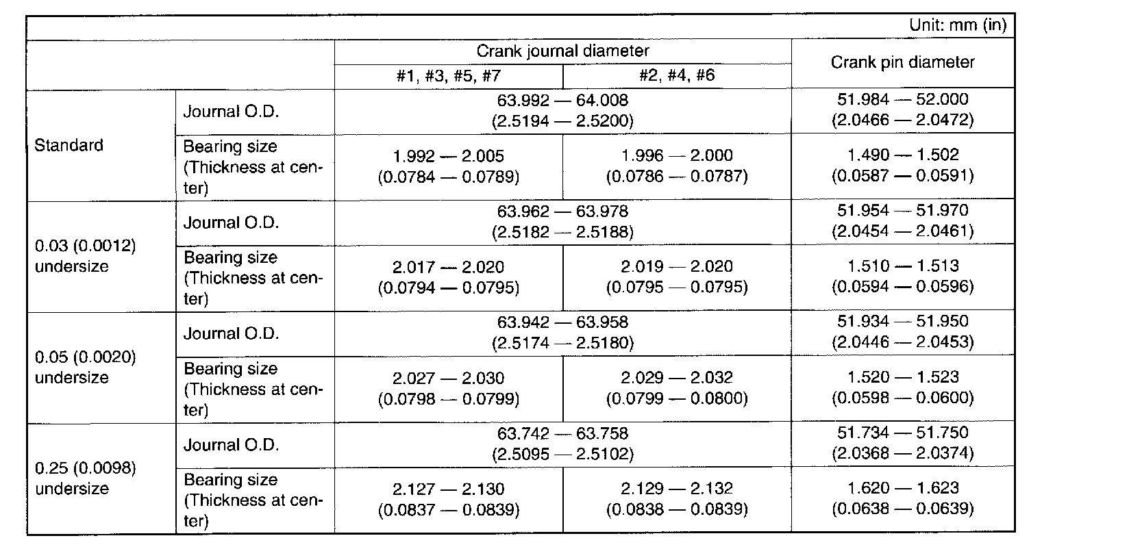 0.25 mm (0.0098 inch) oversize 89.425 - 89.435 mm (3.5207 - 3.5211 inch)
