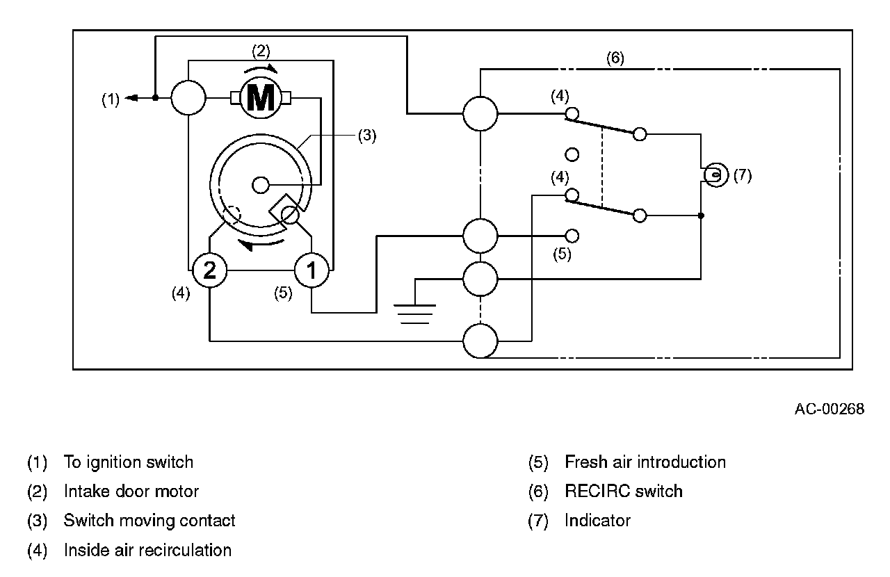 When the recirculation switch is pressed again (the indicator goes out), the ground circuit is formed through terminal 1 rather than terminal 2. The motor makes a rotation in the same direction as when the switch is first pressed - but now opening the intake doors - until the moving contact's slot reaches terminal 1.