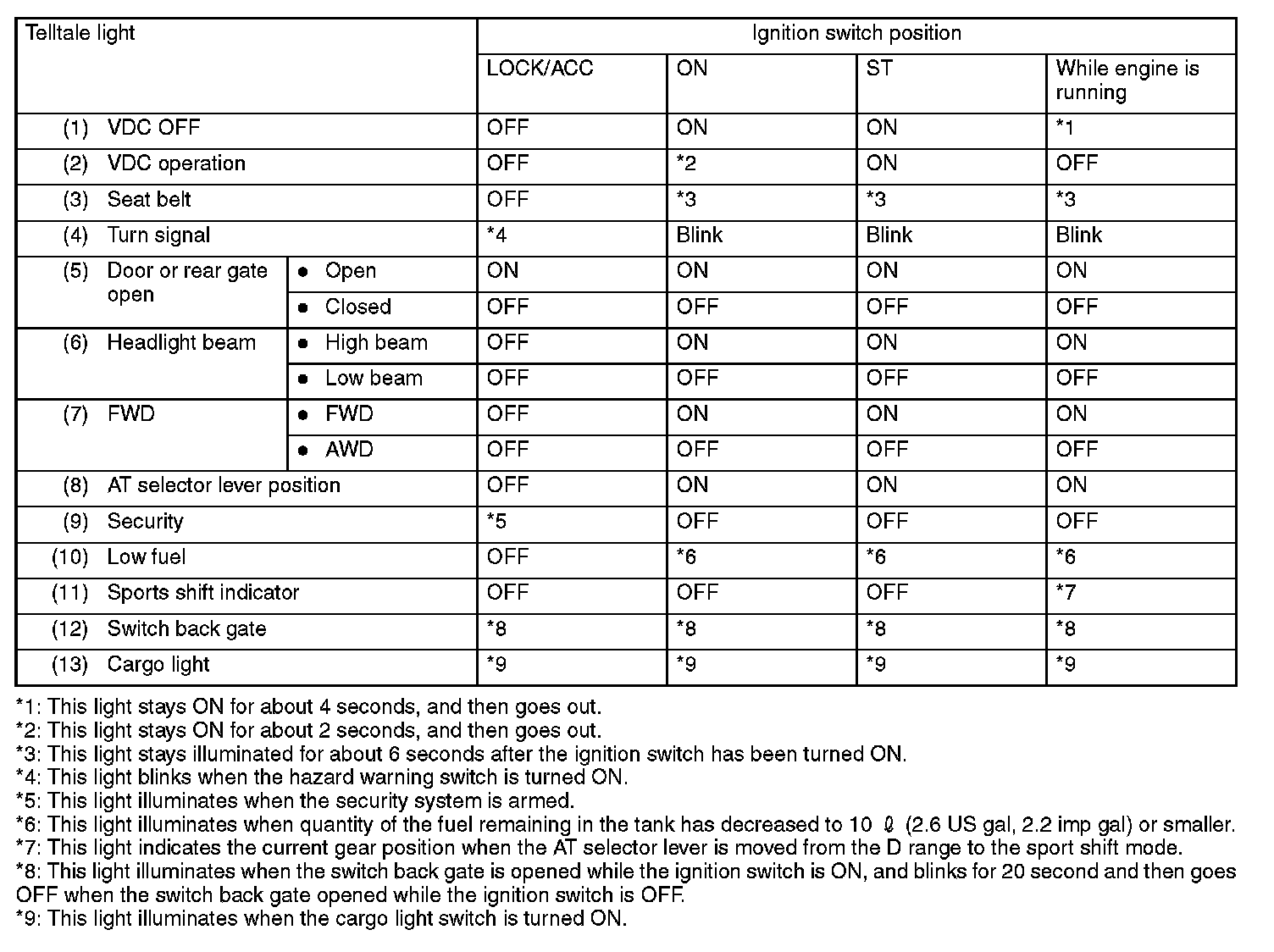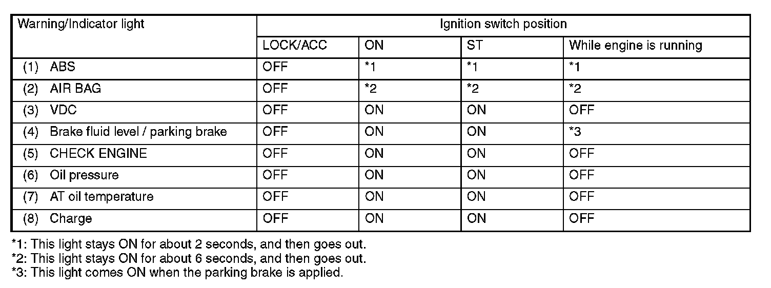 If everything is normal, the warning and indicator lights should be ON or OFF as shown above according to ignition switch positions.