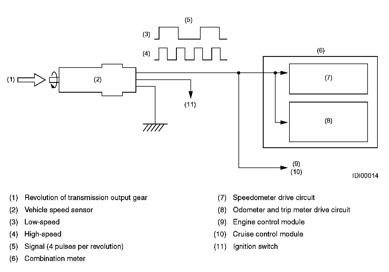 One turn of the driven key in the speed sensor sends 4 pulses to the combination meter, engine control module and cruise control module.
