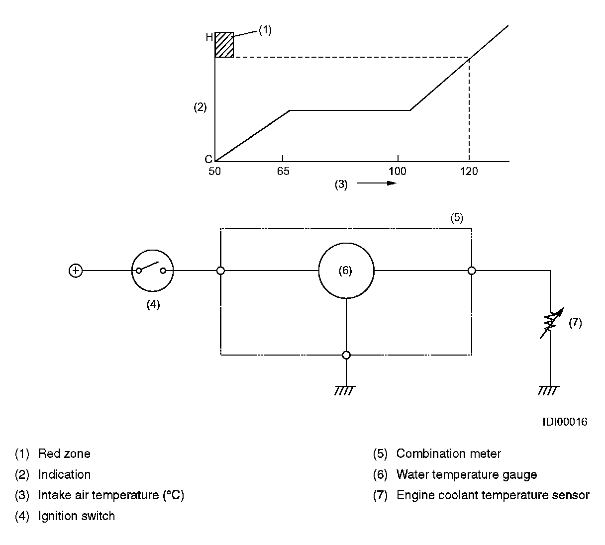 - When the coolant is at a normal operating temperature of approx. 70 to 100 °C (158 to 212 °F), the gauge's needle stays in the middle of the indication range as shown above.