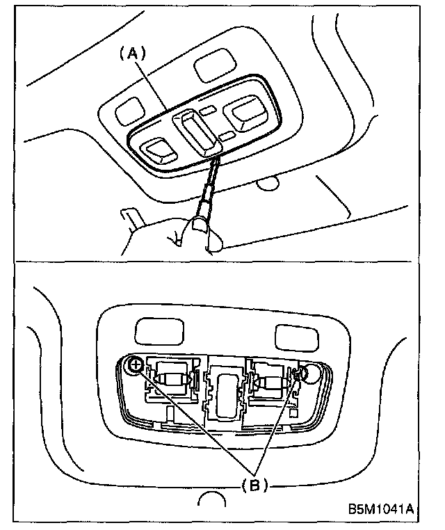 2. Remove lens (A) and spot light mounting screw (B).