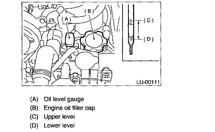 CAUTION: When replenishing oil, it does not matter if the oil to be added is a different brand from that in the engine; however, use oil having the ILSAC or API classification and SAE viscosity No. designated by SUBARU.
