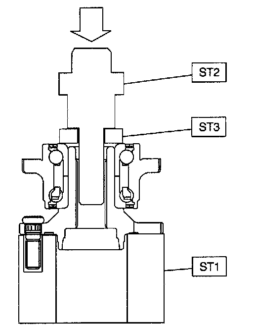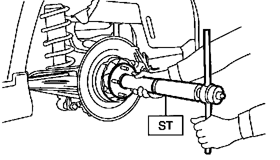 2. Using ST1, ST2 and ST3, press hub unit bearing into hub.