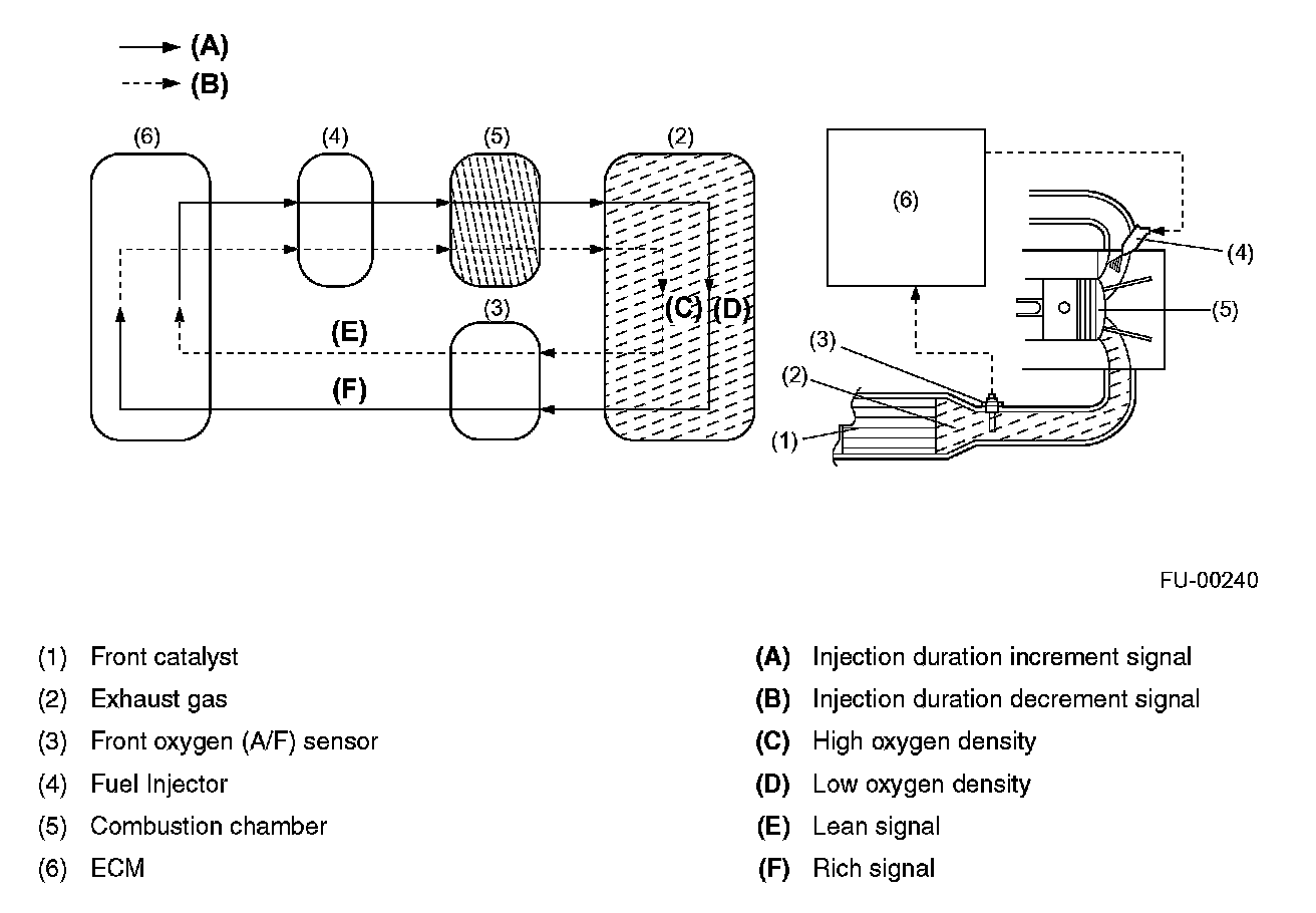 - In the air-fuel ratio feedback control, the ECM calculates the necessary amount of correction based on data from the oxygen sensor and adds the result to the basic duration (which is stored in the ECM's memory for each condition defined by the engine speed and various loads.)
