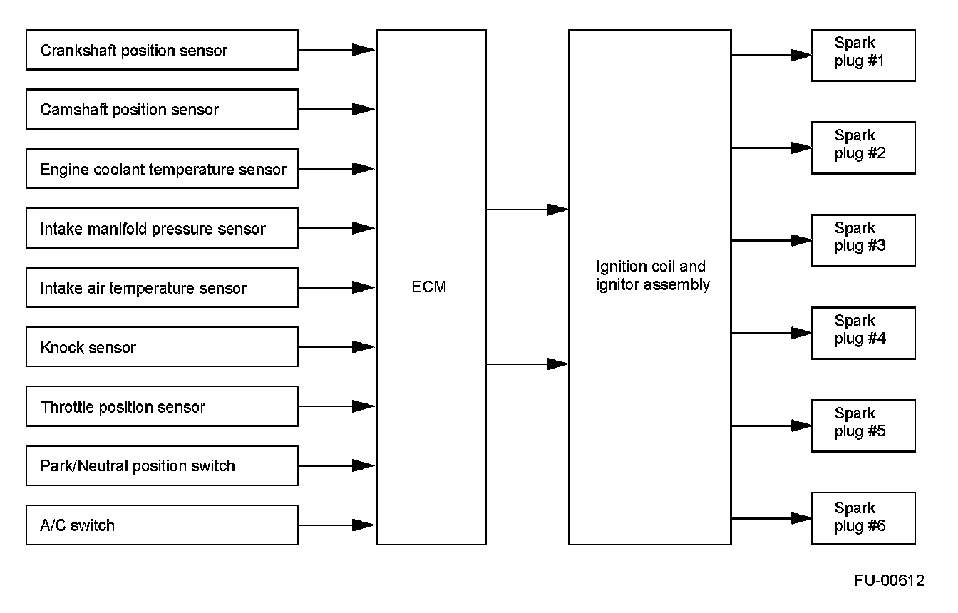 - Ignition control during start-up Engine speed fluctuates during start of the engine, so the ECM cannot control the ignition timing. During that period, the ignition timing is fixed at 10 ° BTDC by using the 10 ° signal from the crankshaft position sensor.
