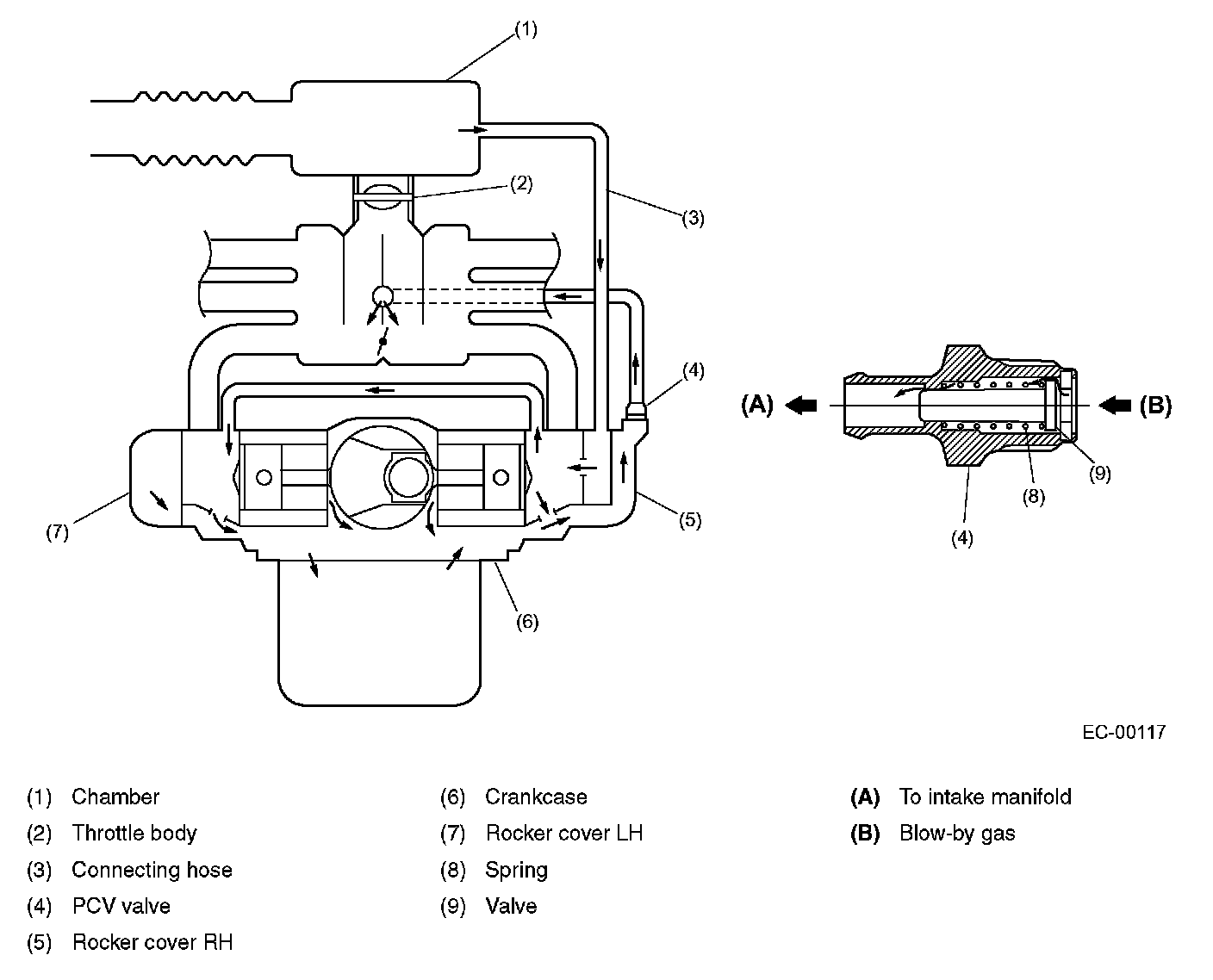 The positive crankcase ventilation (PCV) system prevents air pollution which will be caused by blowby gas being emitted from the crankcase.