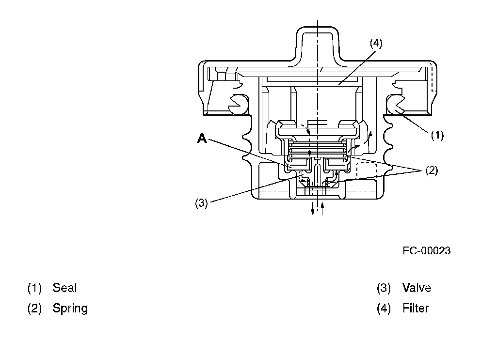 The fuel cut valve is built onto the evaporation pipe of the fuel tank cap. The rising level of the fuel in the fuel tank causes the float to move up and close the cap hole so that no fuel can flow to the evaporation line.