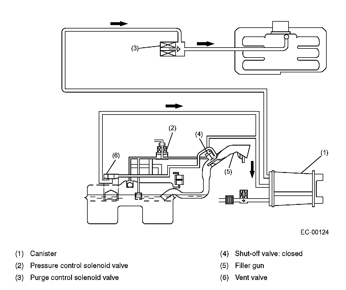 As the fuel enters the fuel tank, the tank inside pressure increases. When the inside pressure becomes higher than the atmospheric pressure, the port of the vent valve opens, allowing the fuel vapors to be introduced into the canister through the vent line. The fuel vapors are absorbed by charcoal in the canister, so the air discharged from the drain valve contains no fuel. When a filler gun is inserted, the shut-off valve closes the evaporation line.
