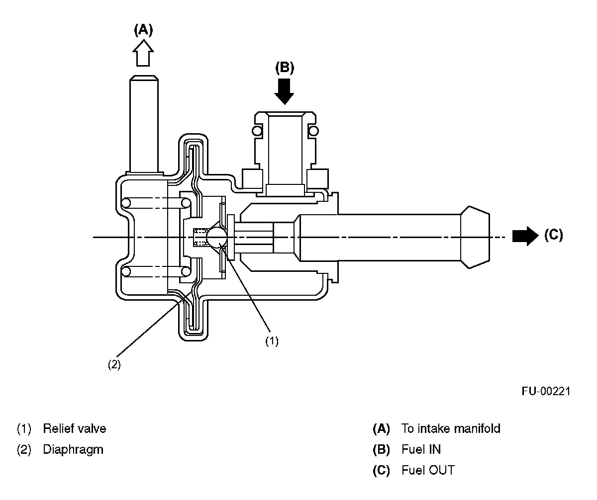 - When the fuel discharge pressure reaches the specified level, the relief valve opens and excess fuel is released into the fuel tank. In this manner, the relief valve prevents an abnormal increase in fuel pressure.