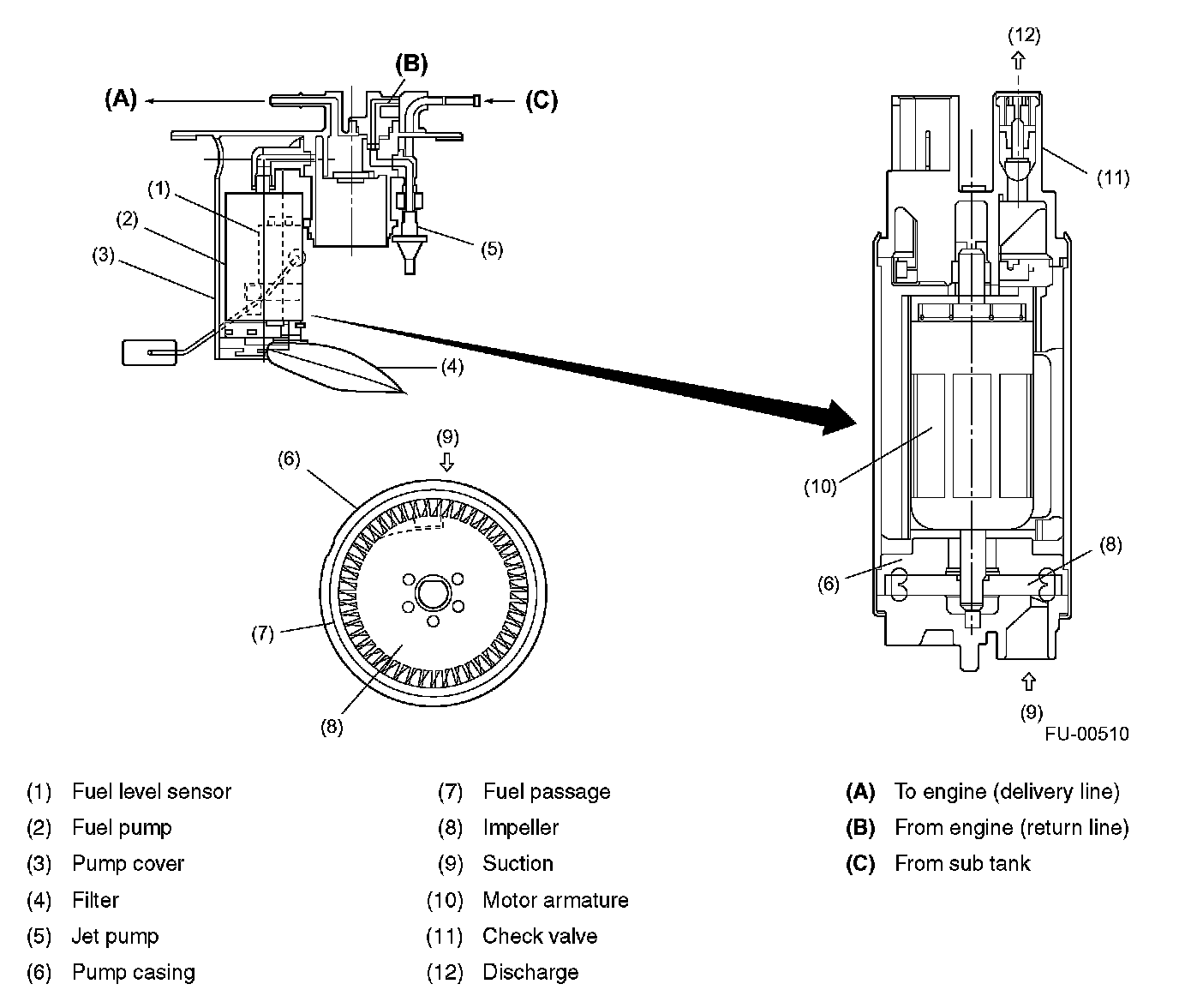 The fuel pump consists of a motor, impeller, pump casing, pump cover, check valve and filter. It is located in the fuel tank and combined with the fuel level sensor into a single unit. The operation of this impeller type pump is very quiet.