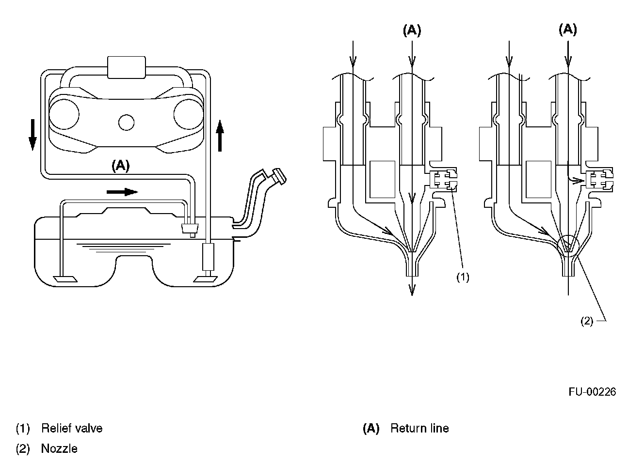 - When the return line nozzle is clogged, the fuel sent back through the return line flows back into the fuel tank via the relief valve.