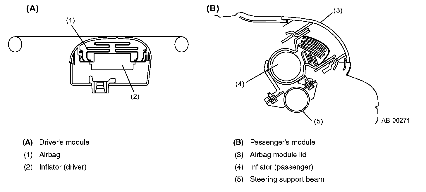 The driver's airbag module is located at the center of the steering wheel and the passenger's airbag module is located at upper portion of instrument panel. Each module contains an airbag and an inflator. If a collision occurs, the inflator produces a large volume of gas to inflate the airbag in a very short time.